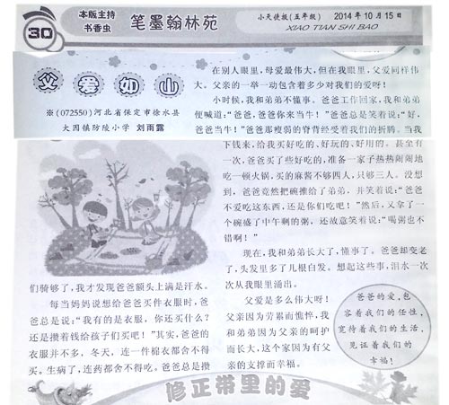 《小天使报》(五年级)2014年10月刊登本站作文《父爱如山》( 刘雨露)。