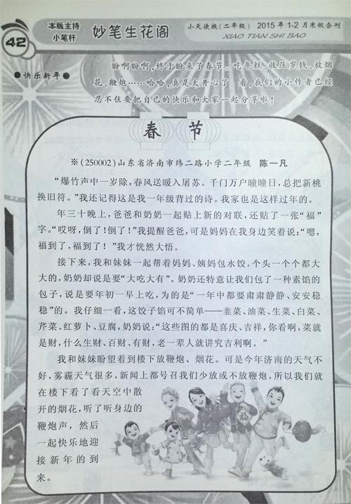 《小天使报》(二年级)2015年1-2月刊登本站作文《我的春节 》(陈一凡)