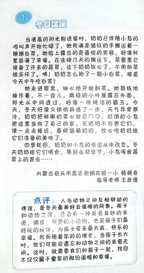 《冬天的脚步》(作者 韩佩奇) 发表在《中国学生健康报》2015年第1期,文章标题改为《冬日温暖》。