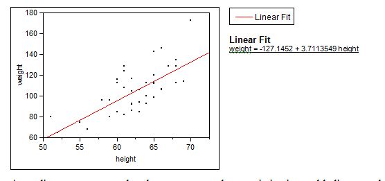 According to our scatter plot, there are curves, the association is roughly linear, and the regression line shows a positive relationship between height and weight. This scatter plot confirmed my expectations of the relationship between height and weight.