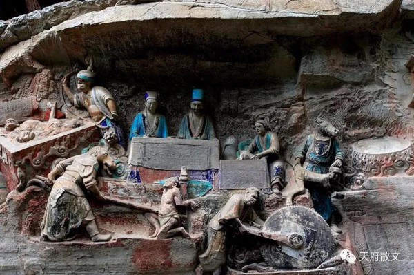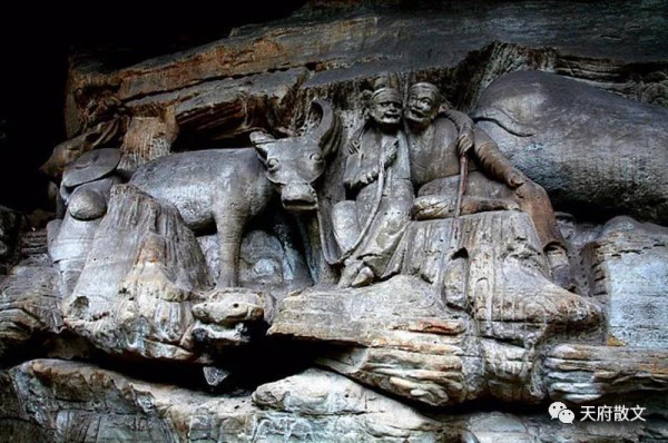 生动有趣的石头,让人目不睱接;会讲故事的石头,让人们振聋发聩。在这些能说会道的石头面前,每只耳朵都无法回避地要灌输进一些既浅显又深邃的道理。每个人来人世间走一遭,姑且不说生死轮回上天堂下地狱,凭着良心该如何为人处事,就足够让人思考一番、实践一世。感谢给这些石头提供了说话机会的大德高僧,更要感谢给这些石头以生命和灵性的普通工匠。如今,大足的石头不仅会说话还会走路。宝顶山山门之外的大街小巷绵延着的商铺地摊,陈列着大大小小的石刻故事里的雕像;还有白发苍苍的老人和稚气未脱的少年,在众目睽睽的围观之中,正手捧各式各样的石材精雕细刻,一个个鲜活的石刻雕像在这些灵巧的手上诞生,随着各种肤色的游人走向四面八方,去到国内国外,用自己熟悉的语言,永无休止地讲述耐人寻味的故事。(图片:网络)