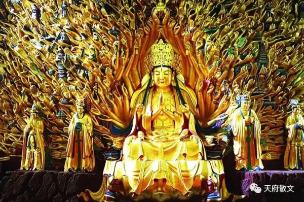 为了回答这个问题,因此我有必要向诸位介绍一处能说会道的石头,这就是距重庆主城约130公里距大足城区东北约15公里的宝顶山摩崖石刻造像艺术,简称大足石刻。准确一点描述,实际上大足境内处处可见石刻,比较集中的就有宝顶山、北山、南山、石篆山、石门山五处。大足石刻虽张扬较晚,但如今已与国内甘肃敦煌、河南龙门、山西云冈三大石窟齐名。其实大足石刻亦即石窟,只是当地人叫习惯了,也觉得无更名的必要,于是继续“石刻”下去。宝顶山是佛教圣地之一。石刻开创者为宋代蜀中高僧赵智凤,始建于南宋,历时70多年,石刻共13处,造像数以万计,以大佛湾和小佛湾规模最大。宝顶山的刻像,大多是一组一组的雕像来连续表达一个或几个不同内容的佛经故事,有如现代的连环画,内容丰富,具有浓郁的民俗地气。众多石雕中,最受人们喜爱的叫做“千手观音”,这是一个非常壮观的雕像。说是“千手”,细细数来应该是1007只手,犹如孔雀开屏,分别从上、左、右三个方向伸出,每只手都雕得纤美细柔,手里拿着各种法器,而且每只手掌中还有一只眼睛,因此又名“千手千眼观音”。传说千手观音原来是印度妙庄王的三公主。妙庄王有3个公主,大公主叫妙金,二公主叫妙银,三公主叫妙善。妙善自幼出家修行,父王不要她去,她坚决要去。她所在的庙宇住有500个大和尚,妙庄王一怒之下一把火把寺庙烧了,500个和尚都被烧死在里面。妙善的父王被如此恶行遭到报应,身上长出500个大浓疮,什么样的药用了均无济于事。医生说要亲骨肉的一只眼一只手做药,才能医好。大公主不愿意,二公主舍不得,只有三公主妙善,毫不犹豫就挖了自己的一只眼、砍下自己的一只手,请医生给父王做药。父王服药后,全身浓疮消失,身体康复。妙善的善行大孝感动了释迦牟尼,因而召见妙善公主:“你为忠心大孝,舍了一只眼、一只手,善有善报,我就还你一千只眼、一千只手。”这样,妙善公主从此成了普行善事的千手千眼观世音菩萨,为世世代代成千上万的善男信女所崇敬,也受到无数世俗百姓所景仰。