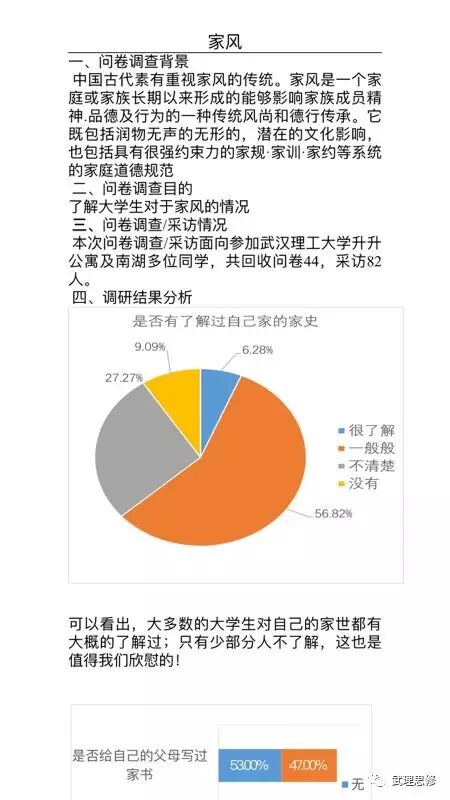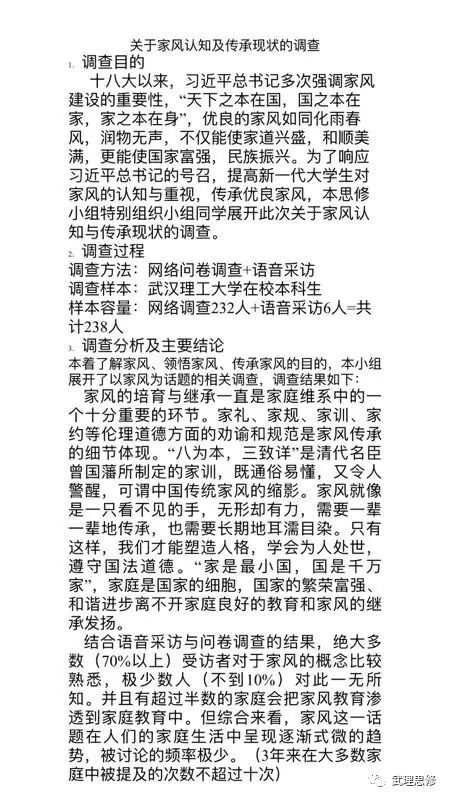 家风调查让我领略以下几点,一是团队合作的重要性,既要有计划的开展,更需要组员的积极参与;二是家风的传承,我认为家风是民族文化和地域差异的缩影,尽管现代社会脚步匆忙,但我们仍需不断继承发扬家风。最后就是更清晰的认识到了自己的家风,能更好的传承下去。