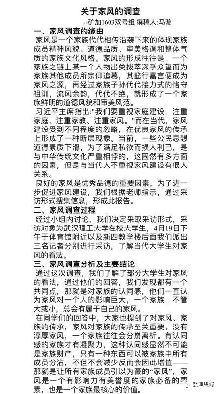 在本次对家风的调查中,我收获了很多,我明白了良好的家风其实是一种正气,是一种道德力量,对一个人的成长有着至关重要的作用。古人云:“近朱者赤,近墨者黑”。在优良家风的熏陶下,人的每一个举止都展现出了一个家庭的道德素养,这个社会需要优良家风为之注入正能量。——矿物1602俞磊
